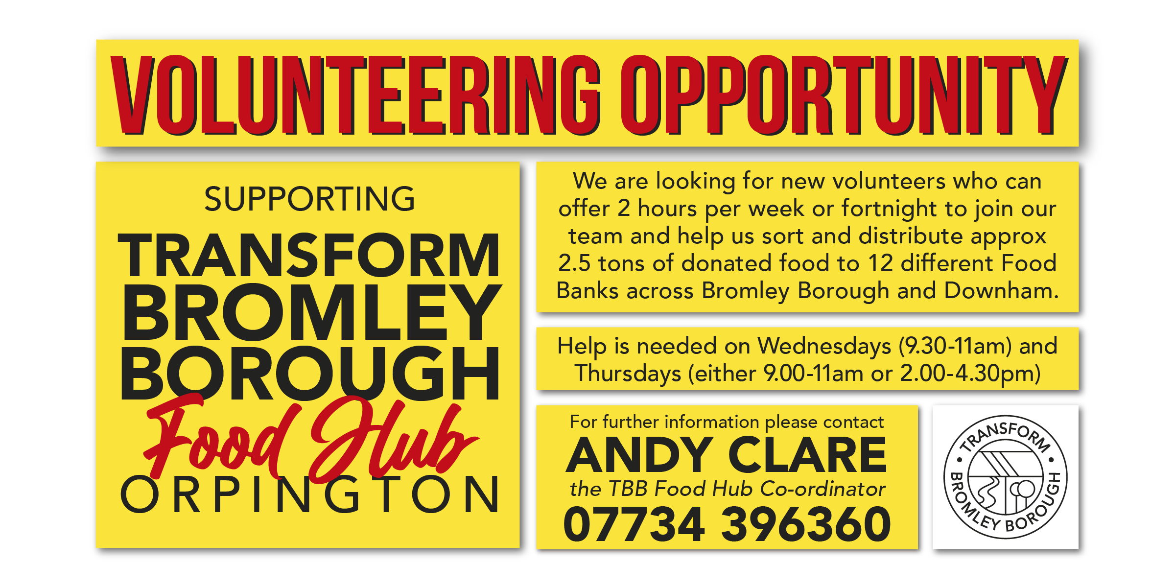 Volunteering Opportunity – supporting the Transforming Bromley Borough (“TBB”) Food Hub based at Hope Church Orpington’s premises in Orpington We are looking for new Volunteers who can offer a minimum of 2 hours (or more a week or fortnight) to help us receive, sort and then distribute approx 2.5 tons of donated food to 12...Continue reading→