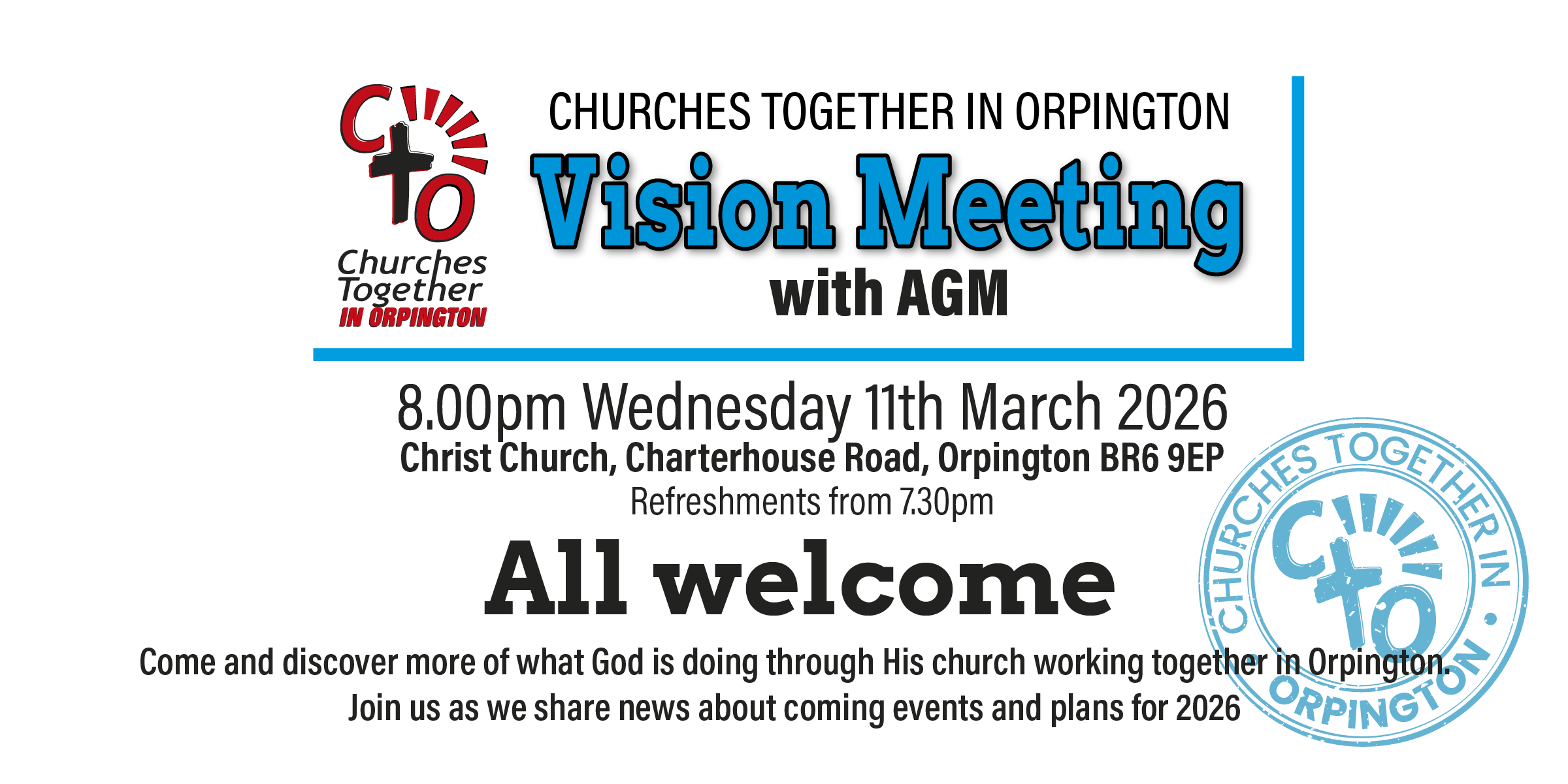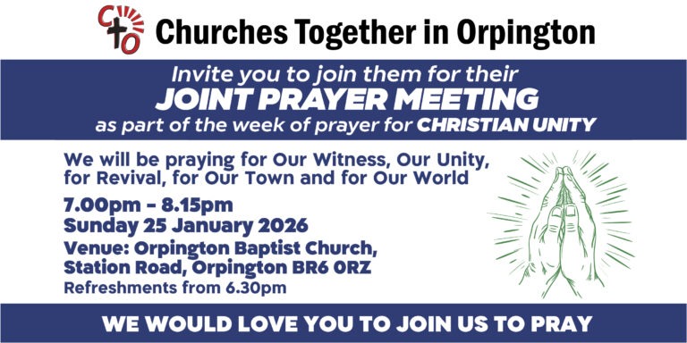 Churches Together in Orpington Invite you to join them for their Joint Prayer Meeting as part of the week of prayer for Christian Unity We will be praying for Our Witness, Our Unity,for Revival, for Our Town and for Our World 7.00pm - 8.15pm Sunday 25 January 2026 Venue: Orpington Baptist Church, Station Road, Orpington...Continue reading→
