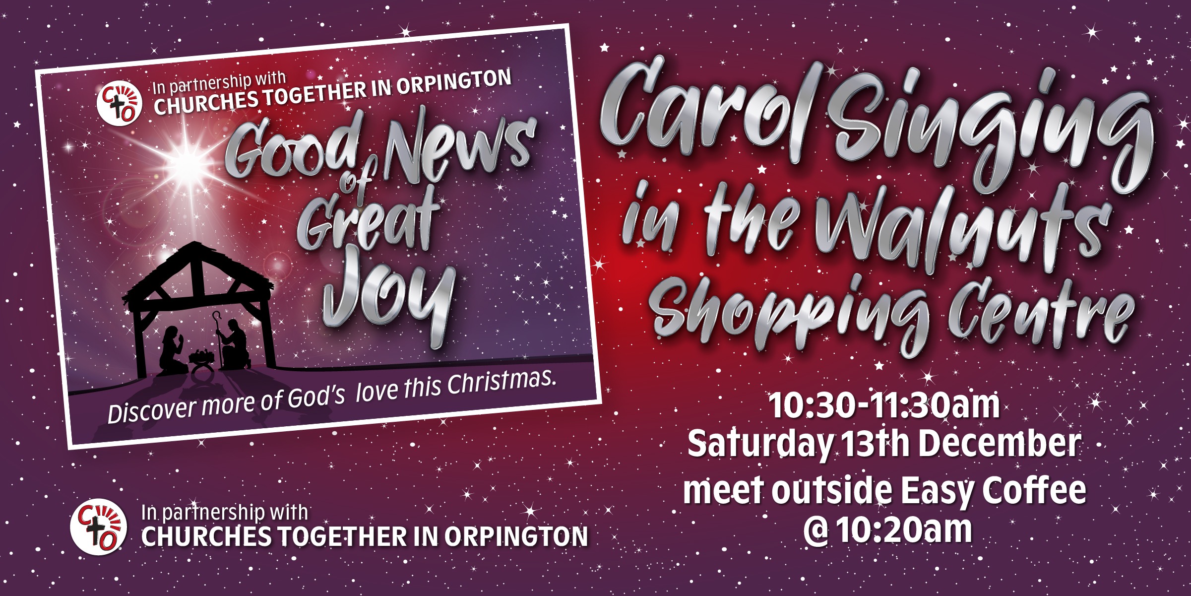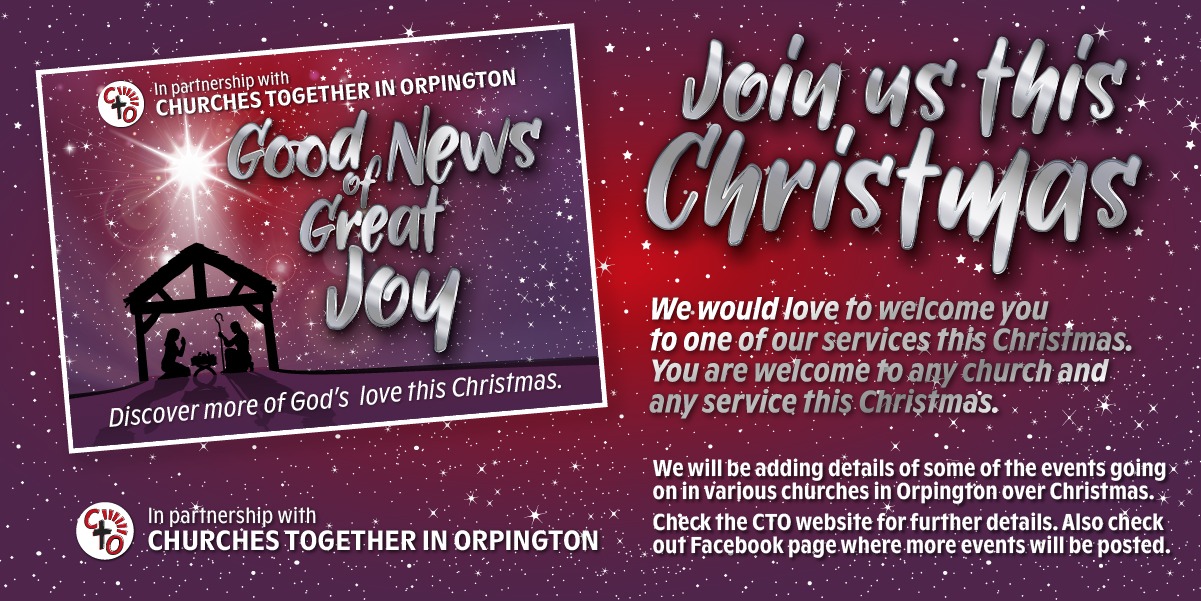 Join other Orpington Churches for Carol Singing in the Walnuts Shopping Centre. 10.30-11.30 Saturday 13th December Meet outside Easy Coffee at 10.25 before gathering at a place in the market square at 10.30 We will also have two opportunities to go out and invite people: Saturday 13th December in the morning, we will be singing...Continue reading